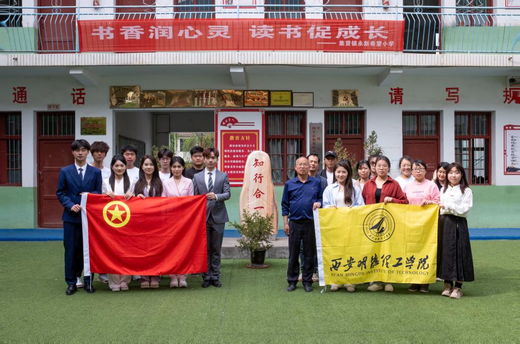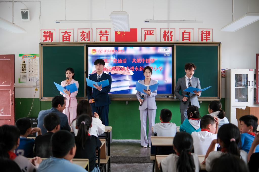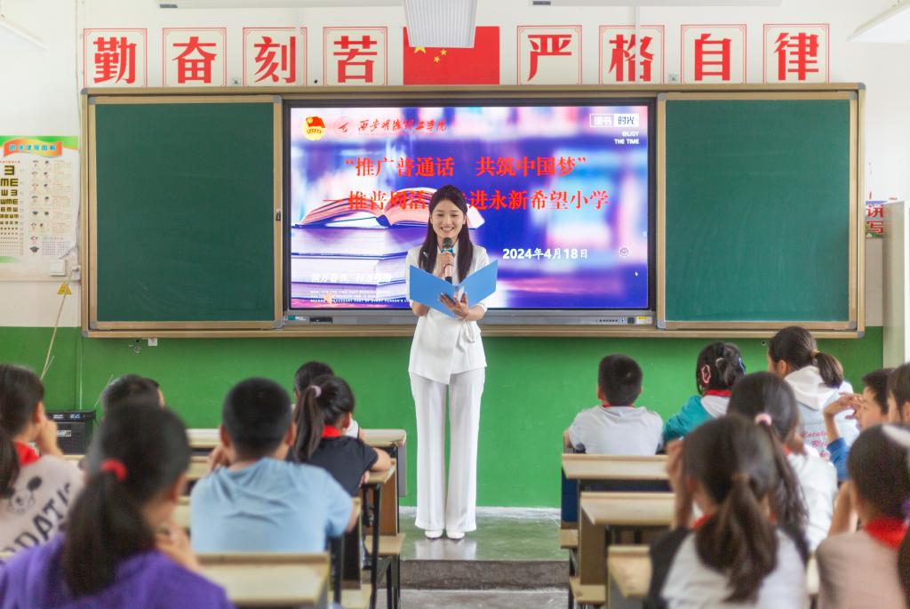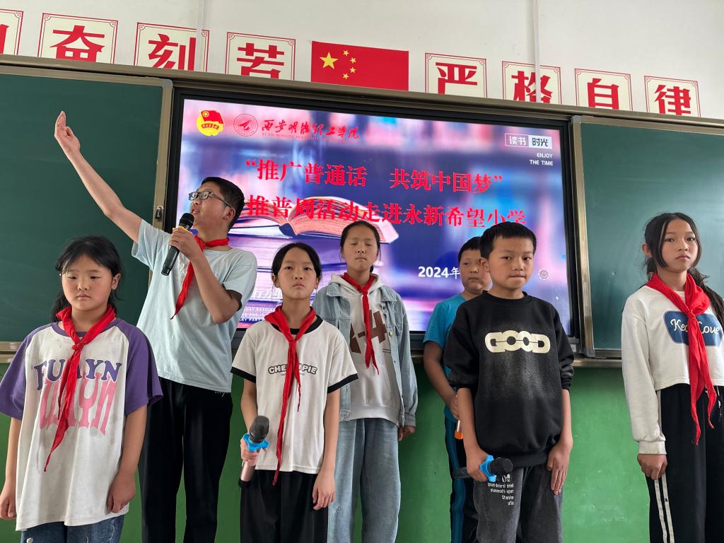 为深入贯彻习近平总书记关于教育的重要论述精神,全面落实全国语言文字会议精神,根据教育部、国家乡村振兴局、国家语委联合印发了《国家通用语言文字普及提升工程和推普助力乡村振兴计划实施方案》,将学讲普通话延伸到家庭社会,加大农村地区国家通用语言文字推广程度。4月,艺术与设计学院团委书记兰艳带领学院学生代表和学校航模队前往周至县集贤镇马滩村永新希望小学开展“推广普通话 共筑中国梦”活动。
