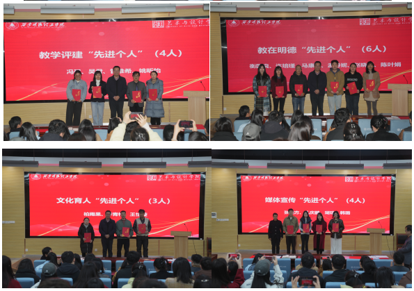 大会伊始,党委副书记乔建宣读了艺术与设计学院2024年关于“先进个人”的表彰决定。学院院长苟秉宸、副院长冯强、党委副书记乔建共同为荣获“先进个人”的教师颁发荣誉证书。苟秉宸院长对获得“先进个人”的教师表示热烈的祝贺,并高度赞扬了他们在教学评建、科研创新、文化育人、实践育人以及学生培养等方面的卓越贡献。他号召全体教职工以获得荣誉的教师为榜样,凝心聚力,迎评促建,共同推动学院各项工作高质量发展。