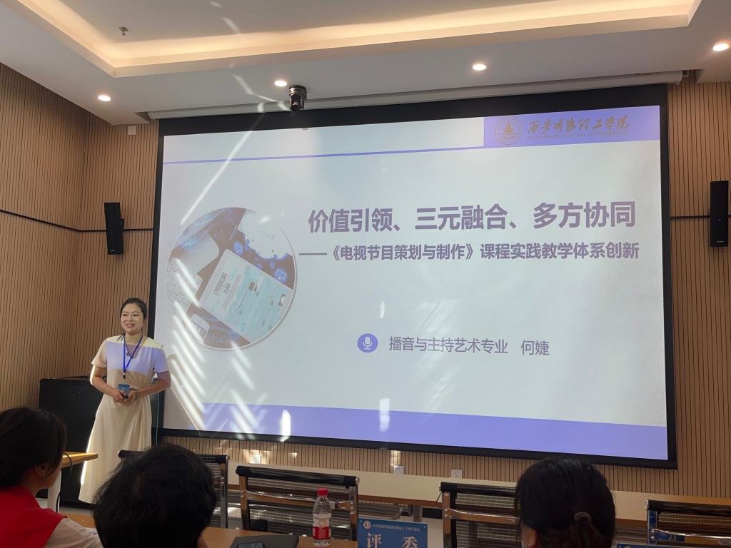会上,何婕老师做了以“价值引领、三元融合、多方协同”为主题的《电视节目策划与制作》课程实践教学体系创新说课报告,获得与会成员的高度好评,同时,王雪娇老师汇报了专业团队在智能传播与新闻创新方面近年来的思路与实践成果,汇报提出了通过教学设计如何与习近平总书记提出的新闻记者践行“四力”原则相匹配,教师需带着学生走向知识,通过5T教学设计变教案为学案,变教师为导师,通过创新与创造鼓励学生成长为应用型媒体人。