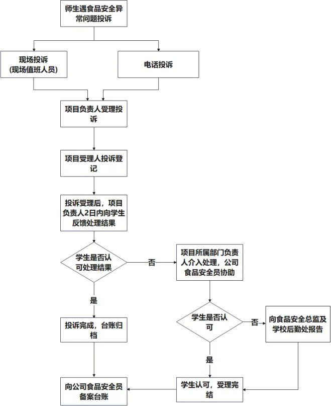 推出“即诉即办服务平台”,多端口、多渠道畅通食堂意见和建议反馈通道,进一步提高广大师生对食堂建设的参与度和饮食保障服务的满意度,了解师生对于食堂的意见与建议,及时高效收集、处理师生对食堂餐饮方面的投诉,切实维护广大师生的利益。设立食品安线上、线下反馈平台,鼓励师生积极参与食品安全监督,对师生反映的问题,做到 “事事有回应,件件有落实”。
