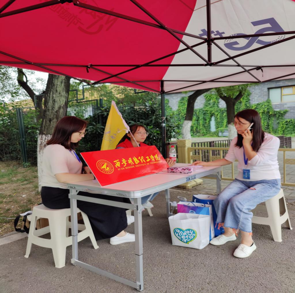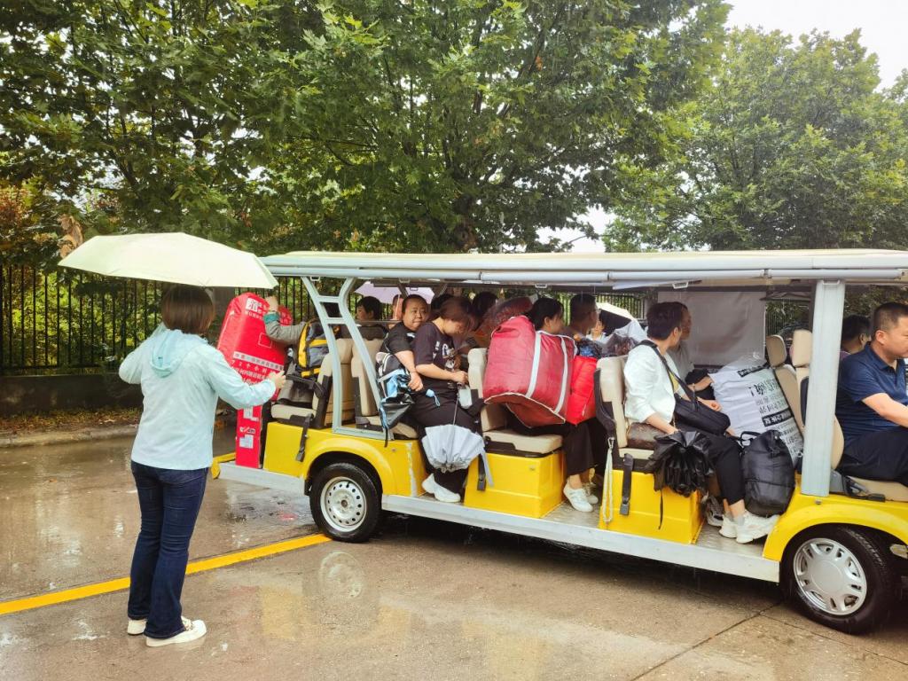 在这场大雨中,后勤管理处的工作人员在早上7点就分别在各自的岗位坚守,在招生就业中心的统一协调下,为新生们搭建起了临时的避雨通道。同时,他们租赁了中巴和电动三轮车,免费为新生转运行李,加快新生报到流程,减少新生和家长在露天滞留时间。他们身着雨衣,手持雨伞,为新生们提供贴心的服务。此外,后勤管理处与图书馆分别在“两 站一场”为新生开通免费接送专线,接送新生和家长。