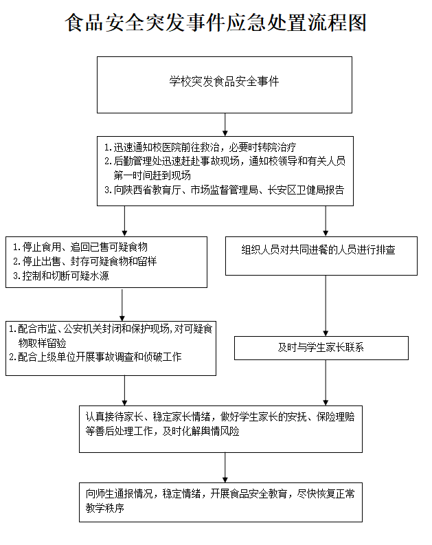 为建立健全食品安全突发事件应急机制,有效预防、及时控制和妥善处置学校食品安全事故 , 高效组织应急救援工作 ,最大限度地预防和减少食品安全事故危害,保障学校师生员工身体健康和生命安全,维护正常的学校秩序。依据《中华人民共和国突发事件应对法》《中华人民共和国食品安全法实施条例》《国家食品安全突发事件应急预案》《陕西省食品安全突发事件应急预案》等法律法规和上级有关文件精神,结合学校实际,特制定本方案。