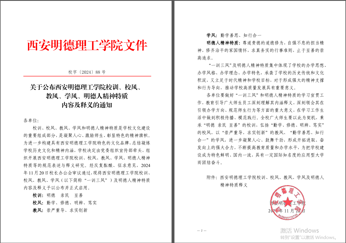坚持明德文化育人特色,印发《beat365vip官网登录入口大学文化建设规划(2024-2028)》《beat365vip官网登录入口明德文化育人实施意见》,构建和完善“五融入”的明德文化育人工作体系。确定学校校训、校风、教风、学风、明德人精神特质等。召开明德文化育人特色建设推进会,举办全国“明德文化与现代文明”研讨会,编写《明德文化概论》校本教材,开展明德大讲堂、亲青大讲堂、明德青年信仰公开课、明德文化读书班等活动,积极筹建明德文化教育馆,将明德文化融入新时代育人工作,培养高素质应用型人才。