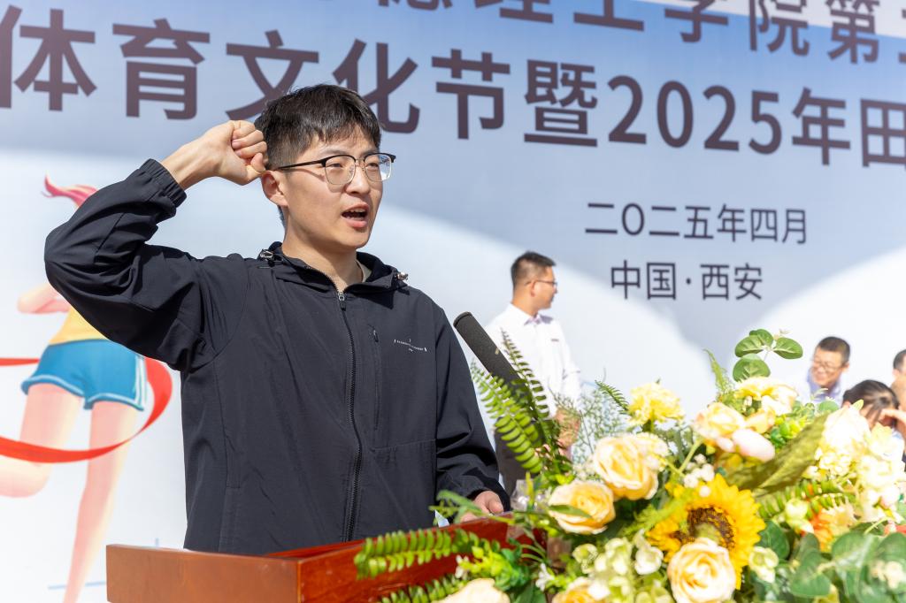校长王志刚致开幕词。他指出,体育兴则国家兴,体育强则民族强,从奥运赛场上的荣耀时刻,到全民健身的蓬勃浪潮,体育精神早已成为凝聚民族力量的精神纽带,激励着一代代中华儿女以顽强拼搏的姿态,在时代“接力跑”中奋勇争先,为民族复兴注入澎湃动能。回顾学校26年的办学历程,学校立足构建“五育并举”育人体系和“健康校园”建设目标,持续加大投入,深化体教融合,不仅优化了校园体育设施,更构建起独具特色的“课堂教学、课外锻炼、竞技比赛、体育文化”四位一体体育育人体系,在师生的共同努力下,学校体育竞赛捷报频传,体育教育成效显著。他向全体师生提出了三点希望:第一,以体育为基,筑牢健康之魂;第二,以拼搏为帆,弘扬体育精神;第三,以公平为尺,守护赛事初心。要求全体师生以体育文化节暨运动会为新起点,凝聚团结协作、奋勇争先的集体力量,以强健体魄、昂扬斗志投身学校建设,以青春之我、奋斗之我,为学校高质量发展注入强劲动能,为培育担当民族复兴大任的时代新人贡献明德力量!