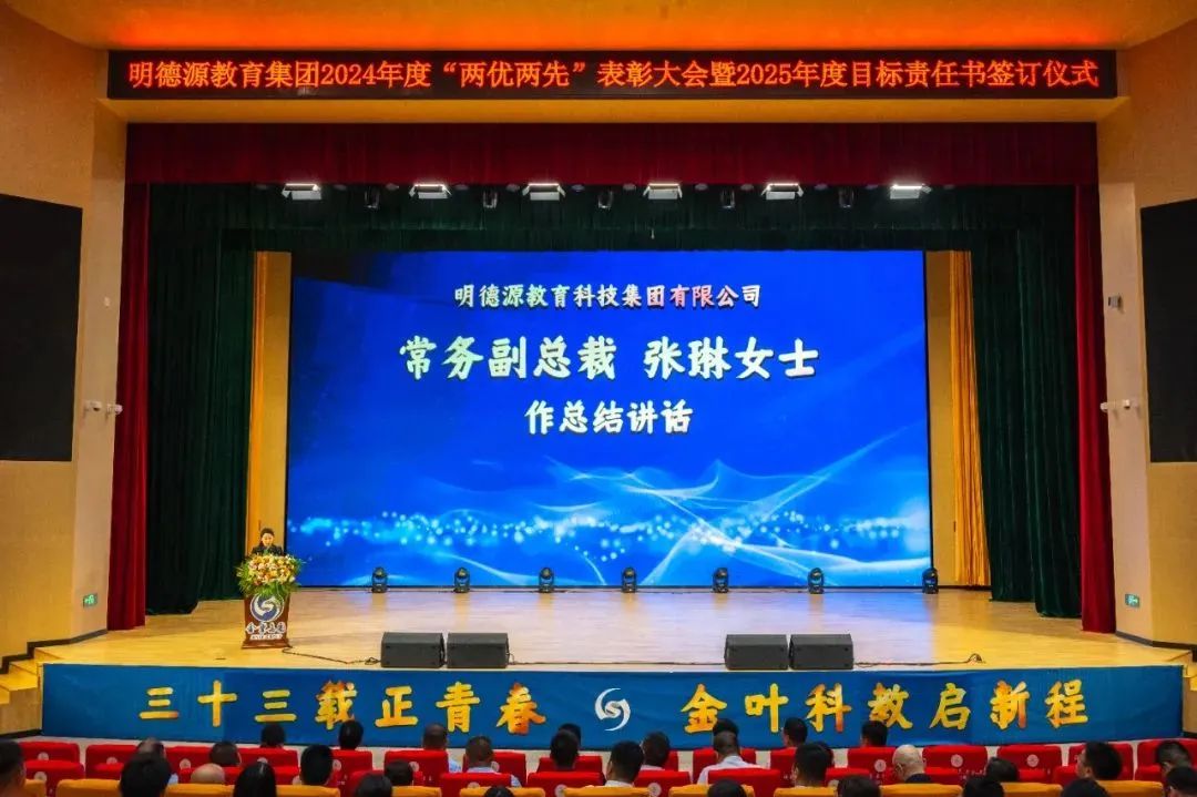 2025年5月30日,学校参加明德源教育集团2024年度“两优两先”表彰大会暨2025年目标责任书签订仪式。金叶科教集团董事局主席、总裁,明德源教育集团董事长、总裁袁汉源先生,明德源教育集团常务副总裁张琳女士出席。会议旨在表彰过去一年中表现卓越的优秀个人和先进集体,明确新一年的发展方向与攻坚任务,凝聚全体员工的共识与力量,共同开启明德源教育集团发展的新篇章。