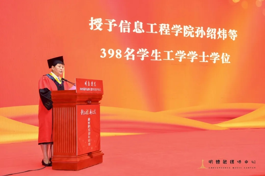 典礼上,党委书记杨健君宣读了《关于表彰2020届优秀毕业生的决定》,学士学位评定委员会常务副主席庾鲜海宣读了《关于2020年普通本科毕业生学士学位授予的决定》。