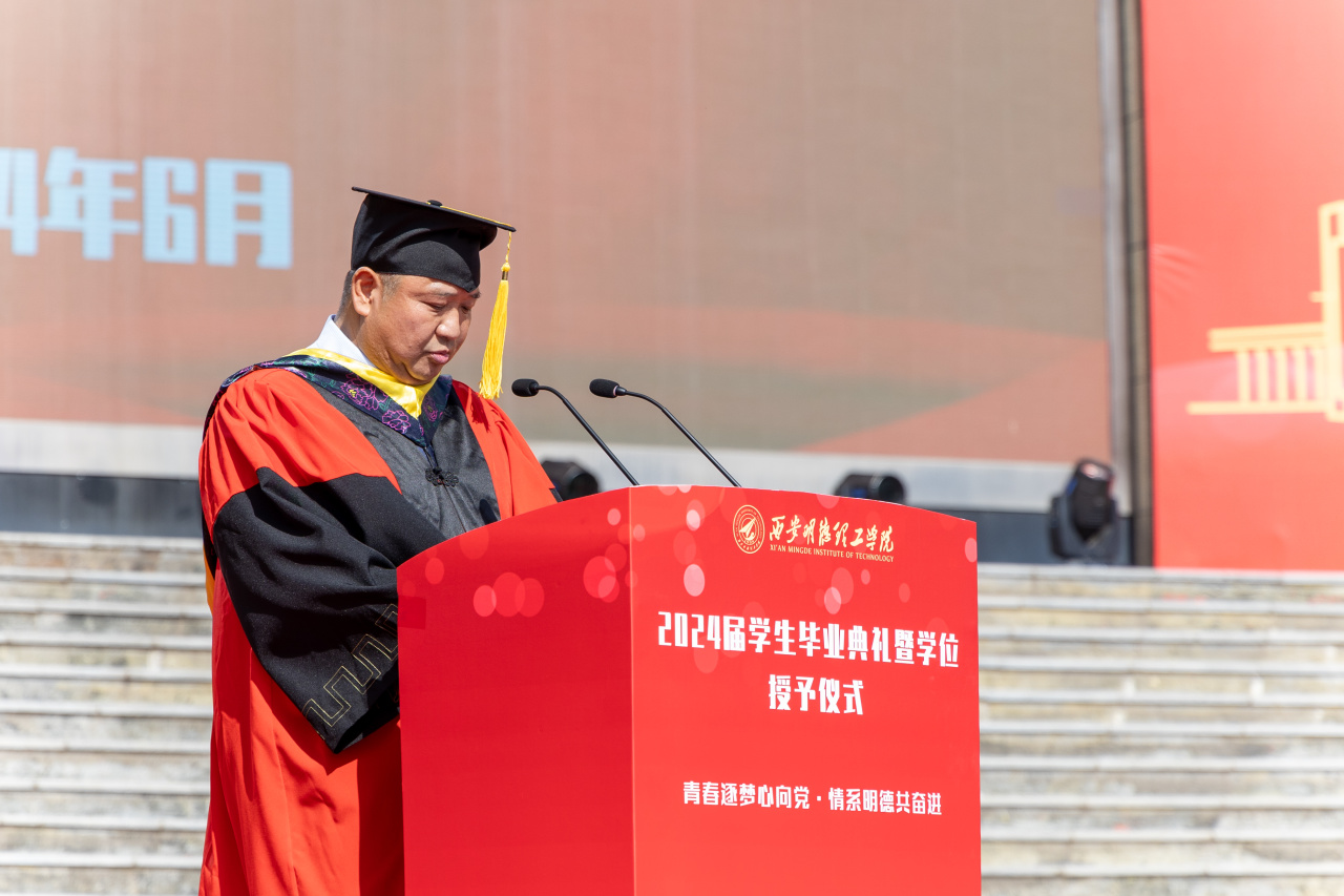 在学位授予仪式上,学校学士学位评定委员会常务副主席、副校长朱延波宣读了《关于2024年普通本科毕业生学士学位授予的决议》。