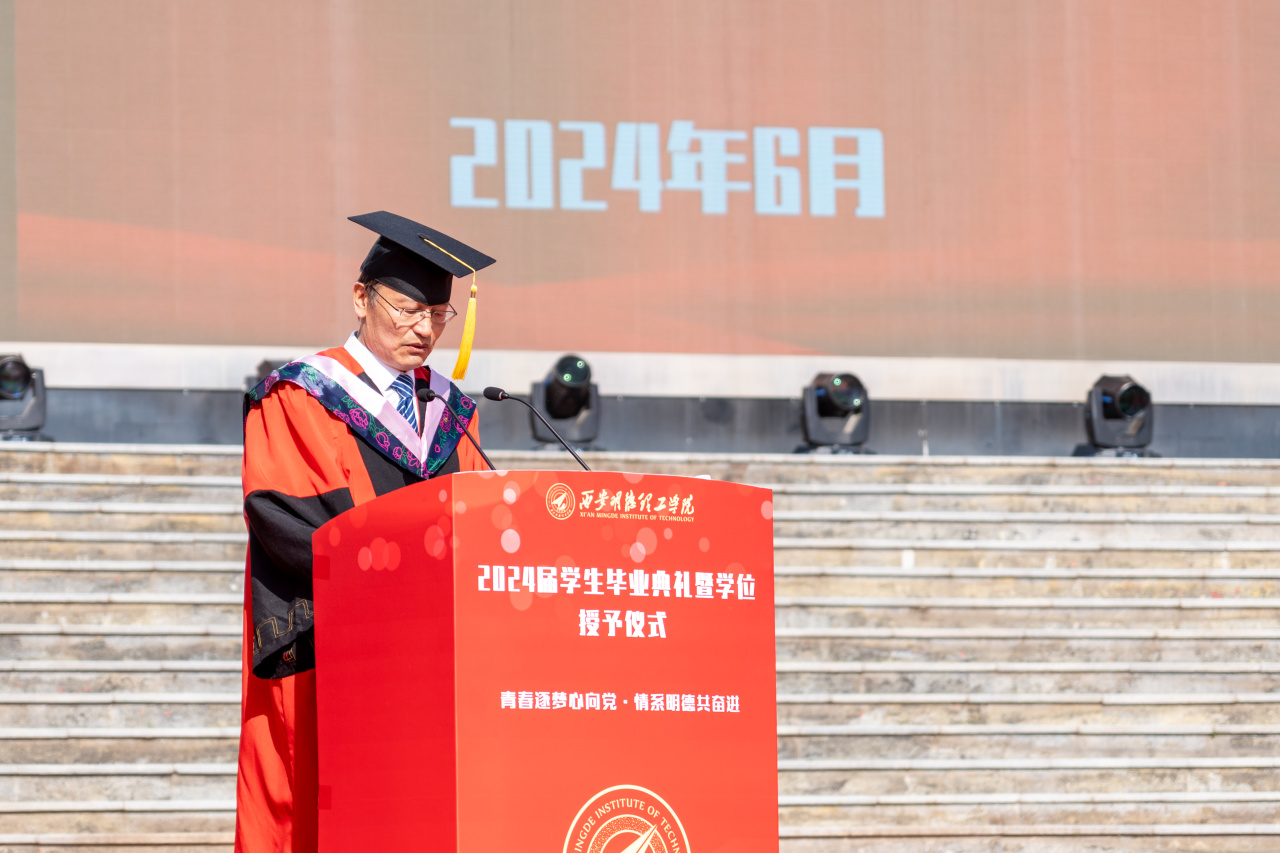 典礼在雄壮的国歌声中拉开序幕。学校党委副书记、副校长白秦川宣读了《关于表彰2024届优秀毕业生及优秀学生干部的决定》。