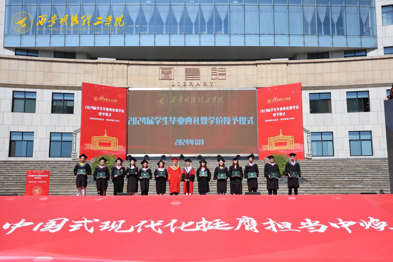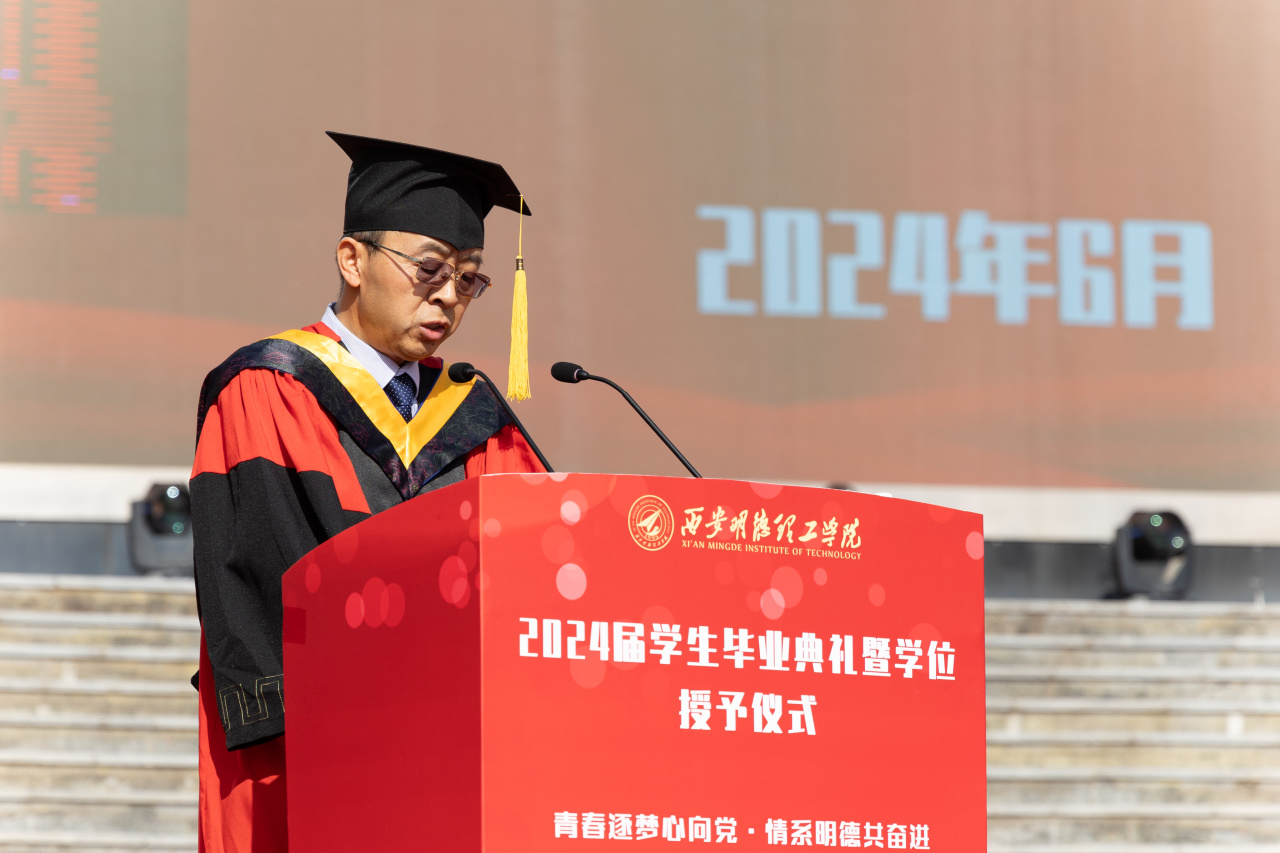 沣水悠悠映柳绿,终南隐隐送花香。6月25日,2024届学生毕业典礼暨学位授予仪式在学校中心广场隆重举行。学校董事长袁汉源,副董事长张琳,校长王志刚,学校党委书记阎东明,以及全体在家校领导,明德源教育集团领导,学校学士学位评定委员会成员、各二级学院领导班子成员、各职能部门、教辅单位负责人,校友代表、毕业生家长代表、毕业班辅导员、2024届毕业生参加典礼。典礼由学校党委副书记、副校长刘星主持。