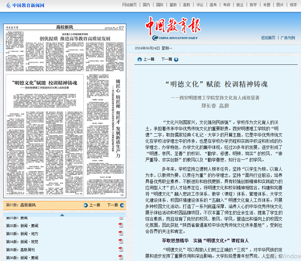 6月24日,《中国教育报》第七版(高校新风)以《“明德文化”赋能 校训精神铸魂——beat365vip官网登录入口坚持文化育人成效显著》为题,报道beat365文化育人工作。