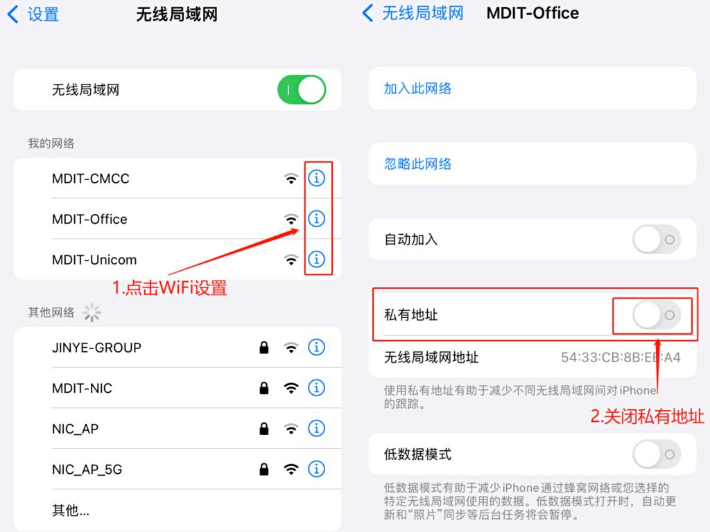 第一步:点击【wifi设置】 第二步:关闭【私有地址】