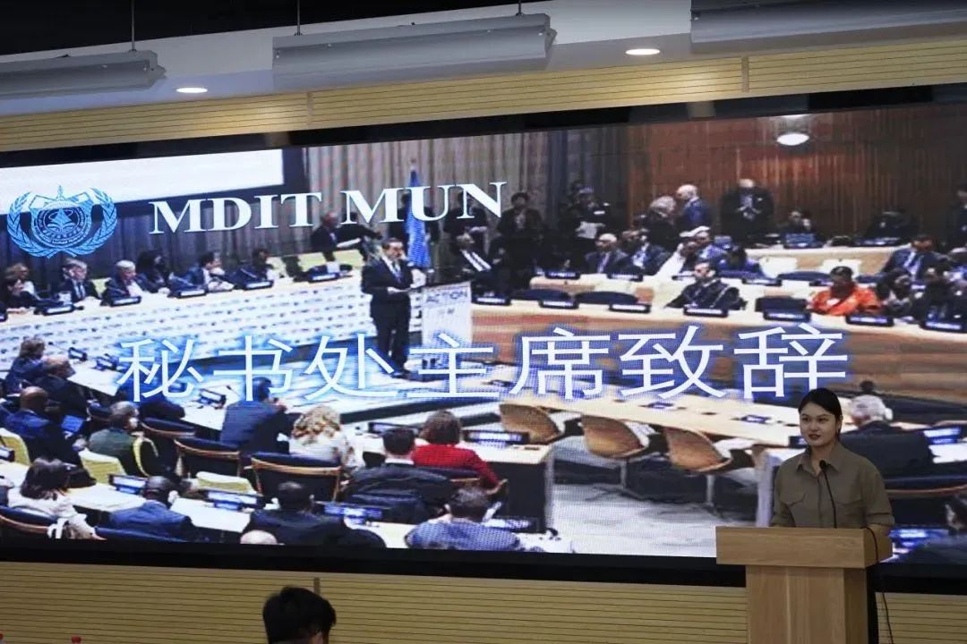 大会秘书长张纾亦在致辞中向学校、老师、工作人员的全力支持表示感谢,更感谢每一位代表的精彩表现。她看到了大家用智慧与激情,在人权、恐怖主义、巴勒斯坦问题等议题中展现了卓越的思辨和协商能力。秘书长还指出会议仍有改进空间,未来我们将优化流程、深化议题,期待与大家在更广阔的平台上,共话国际风云,为模联活动注入新活力!