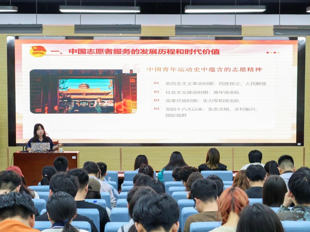 兰艳老师从中国志愿者服务的发展历程和时代价值、志愿服务认知与高校志愿服务的品牌效应、高校志愿服务项目设计方法三个方面进行深入讲解。她讲到,从新民主主义革命时期到党的十八大以来,中国共产党人精神谱系是志愿精神的重要源泉,从硝烟弥漫的革命岁月到力争上游的建设时期,广大青年积极投身时代浪潮,勇毅担当,在国家危难、民众困厄时,在急难险重任务中不避祸福、冲锋在前。从第一支自发组建的“木工青年突击队”到“中国青年志愿者协会”成立,从“向科学进军”到“到西部去”,青年志愿者行动始终与时代发展同向同行,成为具体而现实的当代中国青年运动。高校志愿服务作为高校共青团立德树人、实践育人的重要载体,引领广大青年和学生干部在志愿服务中争当社会主义核心价值观的践行者,将个人奋斗的“小目标”融入党和国家事业的“大蓝图”,用炽热的青春与奋斗践行“请党放心,强国有我”的青春誓言。