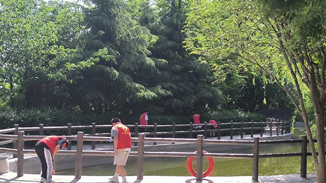 到达骊山之后,团委成员们穿上志愿者服饰,在骊山的上善湖进行环境美化活动。