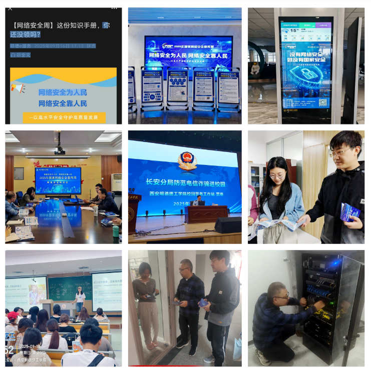 为推动网络安全知识普及落地,学校积极开展宣传“进办公场所、进学生宿舍”活动。工作人员深入一线,发放宣传资料、现场讲解答疑,重点围绕个人信息保护、防范电信诈骗、安全使用移动支付等内容开展针对性指导,有效提升了师生网络安全防护技能。