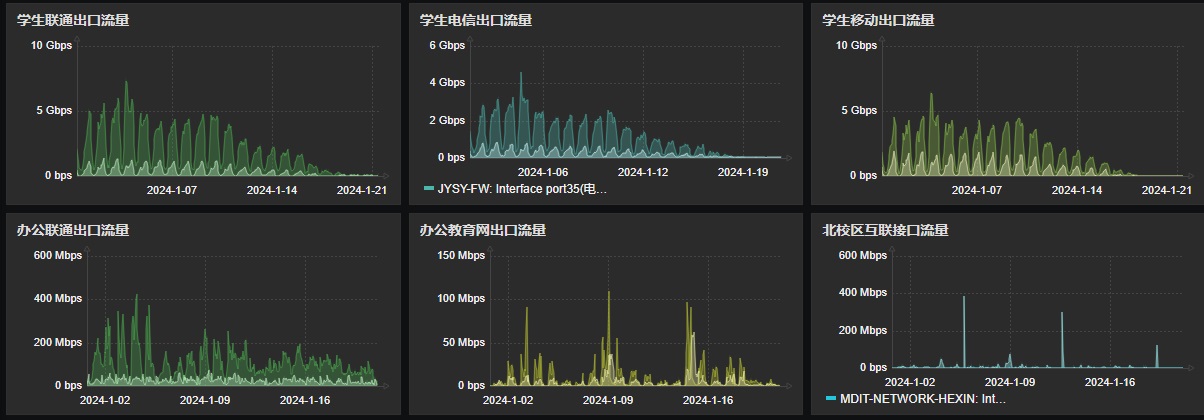 利用ZABBIX等网络监测平台,实时监测校内网络设备运行及流量状态,能够做到及时发现问题及时处理。