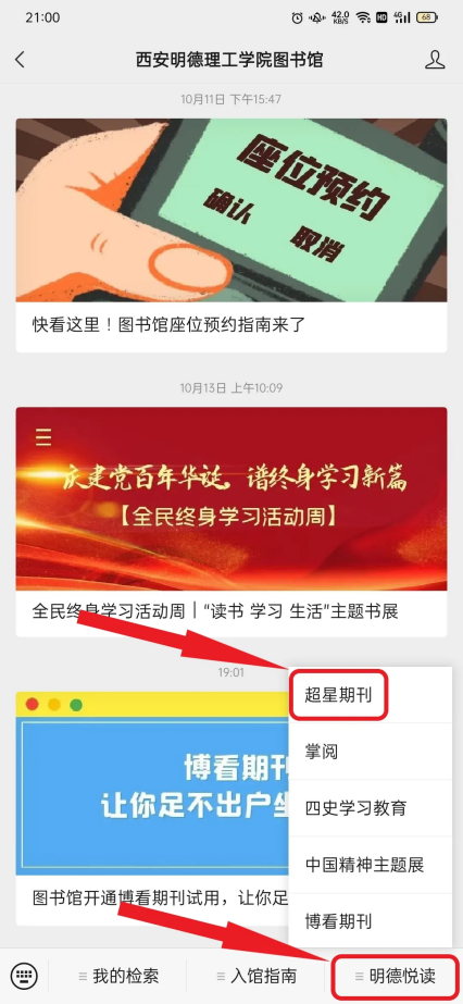 2.点击右下角“明德悦读”,在下拉菜单中点击“超星期刊”。