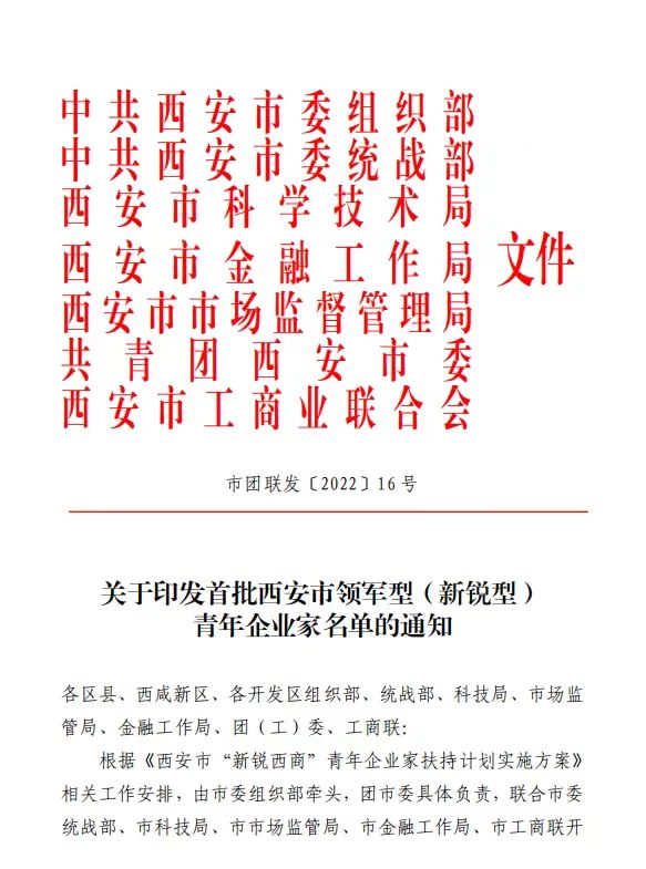 根据《西安市“新锐西商”青年企业家扶持计划实施方案》,共青团西安市委联合市委统战部、市科技局、市市场监管局、市金融工作局、市工商联等单位开展了首批西安市领军型(新锐型)青年企业家人选推荐申报工作。经推荐申报、初步审核、专家评审、会议研究、征求意见等程序,我区7名青年企业家入选,其中2名为首批西安市领军型青年企业家,5名为首批西安市新锐型青年企业家。