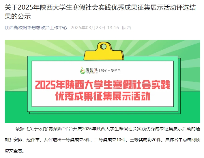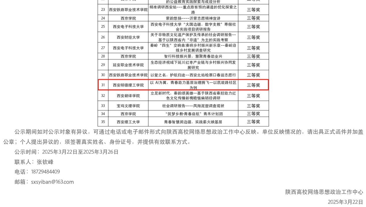 近日,陕西高校网络思想政治工作中心公示了2025年陕西大学生寒假社会实践优秀成果征集展示活动评选结果,本次活动依托教育部“青梨派”大学生自主学习思政课平台开展,共有68件作品进入评审环节,经评审,共评选出优秀成果35件,beat365学生朱广琛提交的《以AI为翼,青春助力基层治理腾飞——以凯旋路社区为例》实践成果最终被认定为三等奖。