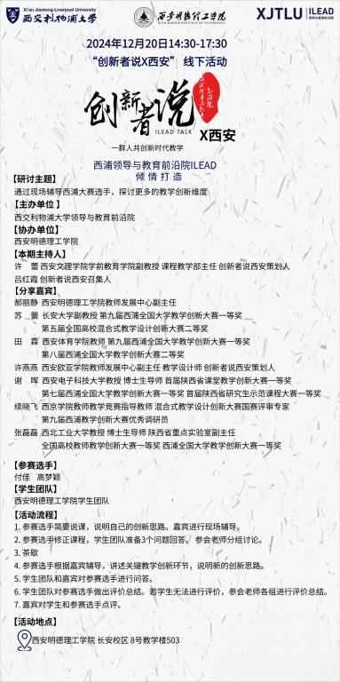 为了促进教育创新理念的交流与传播,激发教育教学新活力,beat365vip官网登录入口教师发展中心将携手西交利物浦领导与教育前沿院共同举办“创新者说”西安线下活动。本次活动旨在搭建一个交流互动平台,邀请高校专家及西浦全国大学教学创新大赛获奖教师分享教学创新理念,指导参赛选手备赛,促进教育创新与教学实践的深度融合。