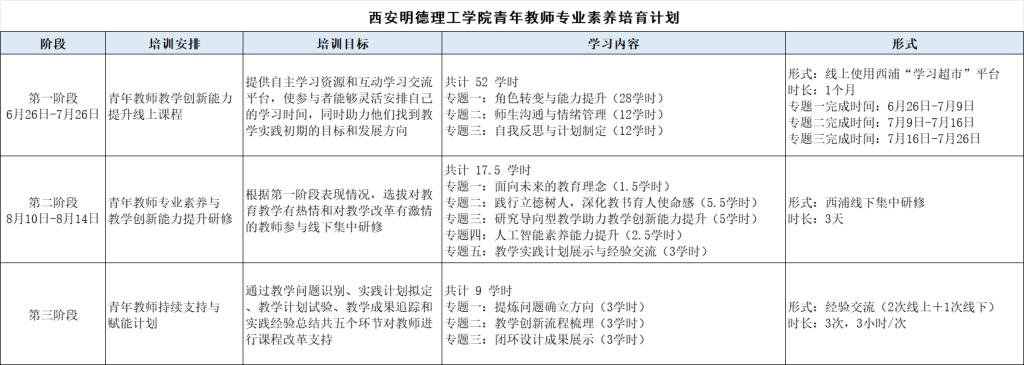 详见附件1:青年教师专业素养培育计划培训内容。培训日程若有变更,请及时关注后续发布的更新通知,并以最终版安排为准。感谢您的配合!