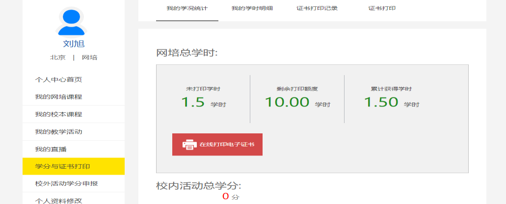 下载证书:学员在个人中心“学分与证书打印”模块申请电子证书。具体操作流程也可看附件2:学员使用指南 第8页。