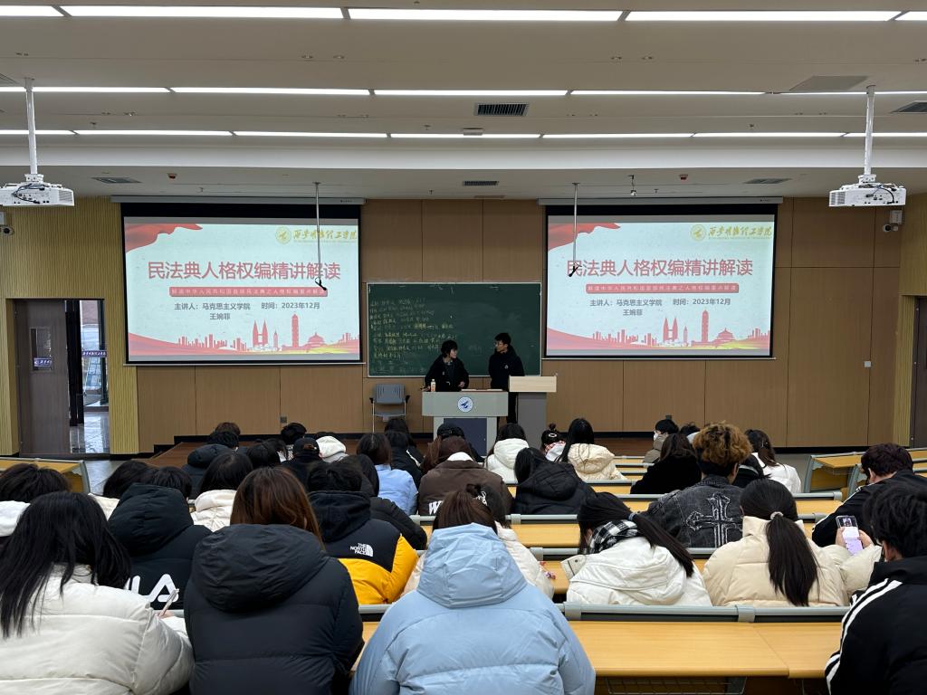2023年12月19日,马克思主义学院王婉菲老师为大家重点解读了中华人民共和国首部民法典之人格权。以《民法典》中的亮点内容为主线,向同学们进行了细致讲解,很好地展示了法律的实用性和普遍性。在法律面前,每一个生命都应该得到尊重和保障,这是立法的本源,也是司法的核心。《民法典》所形成的对每一个自然人全方位的保护体系,切实体现了“以人民为中心”的立法理念,彰显了《民法典》作为权利法典的根本属性。同时告诫同学们要从自身做起,加强思想道德修养和自我保护意识,要善于运用法律武器维护自己的合法权益。