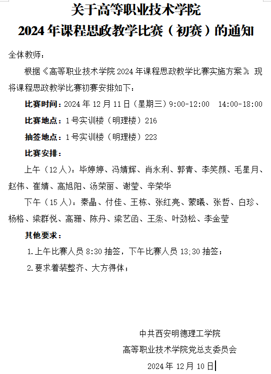 此次课程思政教学比赛是高等职业技术学院落实课程思政,践行立德树人根本任务的重要举措。通过全体专职教师的参赛的方式,目的是全面、有效推进课程思政建设,切实提高教师课程思政教学水平和思政育人能力,扎实推进了高等职业技术学院的思政育人工作,践行了习近平新时代中国特色社会主义思想进教材进课堂进学生头脑。