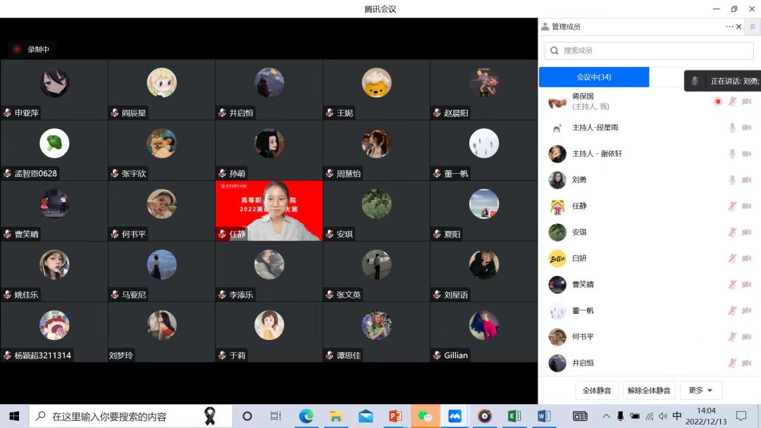 12月13日下午,高等职业技术学院第二届英语拼词大赛决赛线上举行。语言文化传播学院副院长刘勇教授、应用英语专业负责人徐微副教授、语言文化传播学院办公室主任于莉副教授、专业教师白妍、蒋保国作为嘉宾出席了比赛,郑永堂老师和任静老师担任考官。在决赛中,各位选手表现优异,稳定发挥,充分展现出英语专业同学们的专业能力。