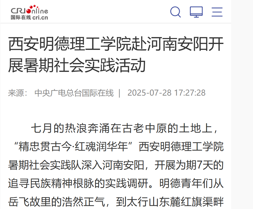 七月的热浪奔涌在古老中原的土地上,“精忠贯古今·红魂润华年”beat365vip官网登录入口暑期社会实践队深入河南安阳,开展为期7天的追寻民族精神根脉的实践调研。明德青年们从岳飞故里的浩然正气,到太行山东麓红旗渠畔的奋斗史诗,从乡村振兴示范村到科技企业前沿,以脚步丈量历史厚度,用行动阐释青春担当,深刻体悟“精忠报国”在新时代的磅礴伟力。
