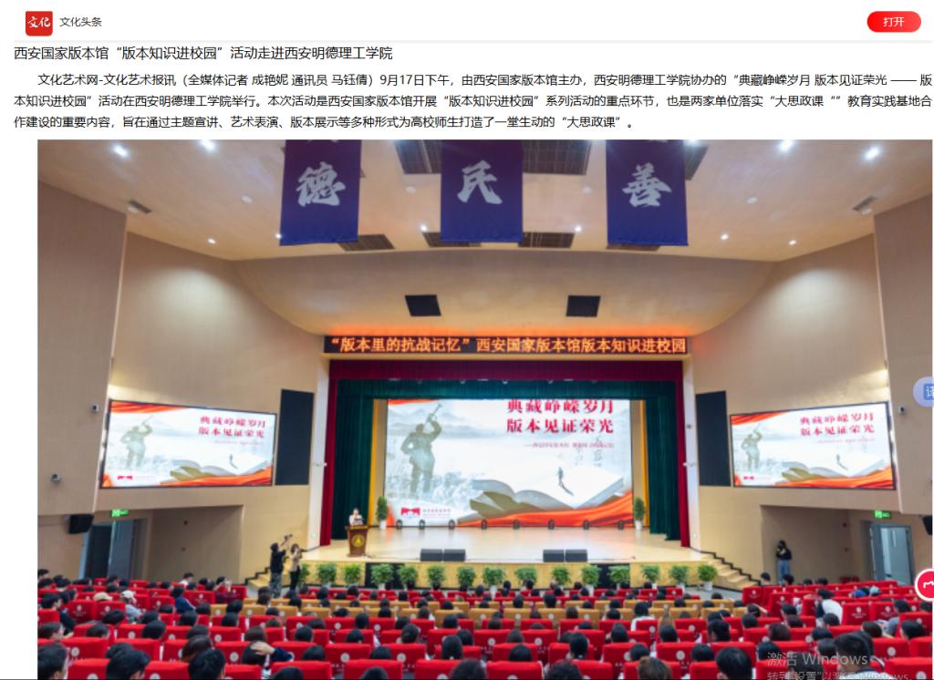 文化艺术网-文化艺术报讯(全媒体记者 成艳妮 通讯员 马钰倩)9月17日下午,由西安国家版本馆主办,beat365vip官网登录入口协办的“典藏峥嵘岁月 版本见证荣光 —— 版本知识进校园”活动在beat365vip官网登录入口举行。本次活动是西安国家版本馆开展“版本知识进校园”系列活动的重点环节,也是两家单位落实“大思政课“”教育实践基地合作建设的重要内容,旨在通过主题宣讲、艺术表演、版本展示等多种形式为高校师生打造了一堂生动的“大思政课”。