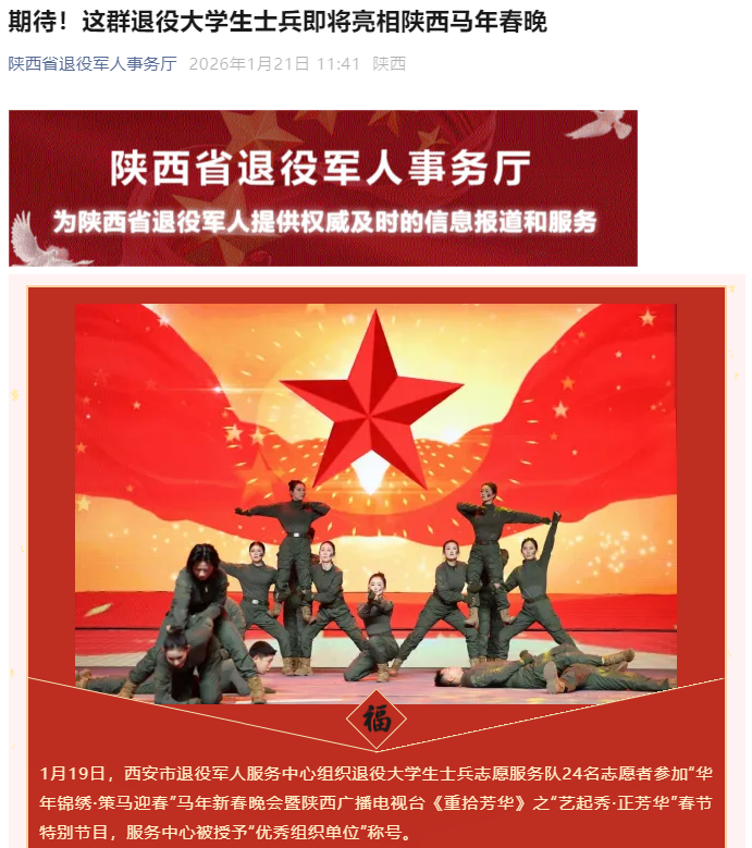 1月19日,西安市退役军人服务中心组织退役大学生士兵志愿服务队24名志愿者参加“华年锦绣·策马迎春”马年新春晚会暨陕西广播电视台《重拾芳华》之“艺起秀·正芳华”春节特别节目,服务中心被授予“优秀组织单位”称号。