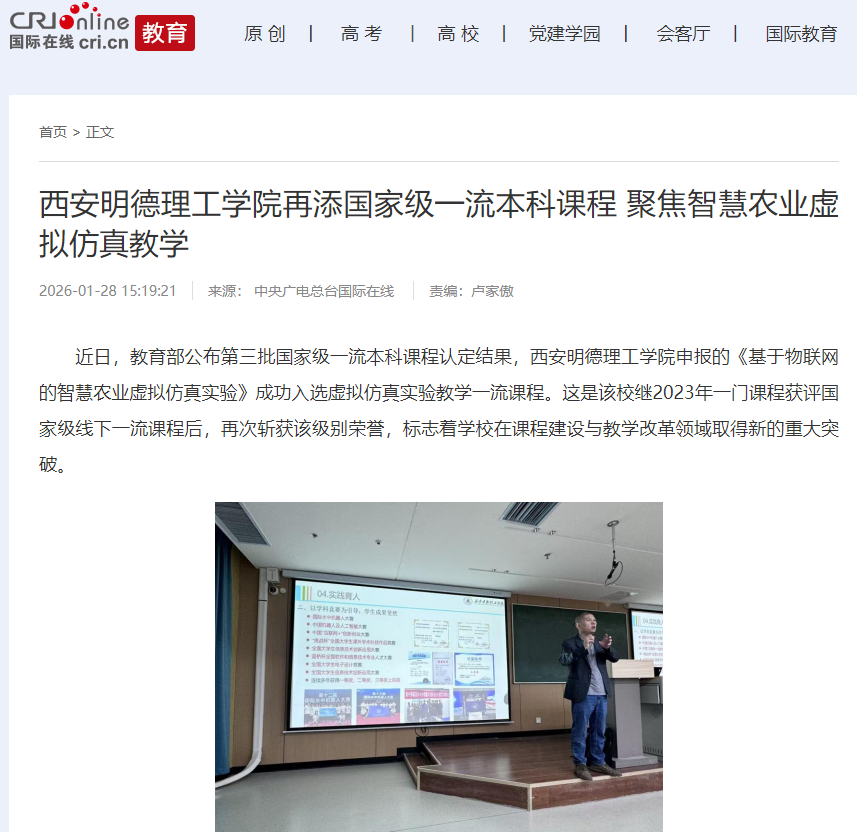 近日,教育部公布第三批国家级一流本科课程认定结果,beat365vip官网登录入口申报的《基于物联网的智慧农业虚拟仿真实验》成功入选虚拟仿真实验教学一流课程。这是该校继2023年一门课程获评国家级线下一流课程后,再次斩获该级别荣誉,标志着学校在课程建设与教学改革领域取得新的重大突破。