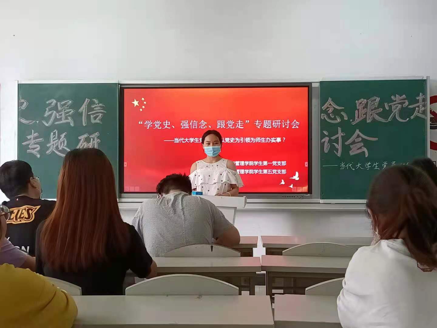 为庆祝中国共产党成立100周年,进一步学习贯彻习近平总书记在全国党史学习教育动员大会上的重要讲话精神,5月9日下午,经济与管理学院学生第一党支部、学生第五党支部全体党员在育德楼108教室召开“学党史、强信念、跟党走”专题研讨会。