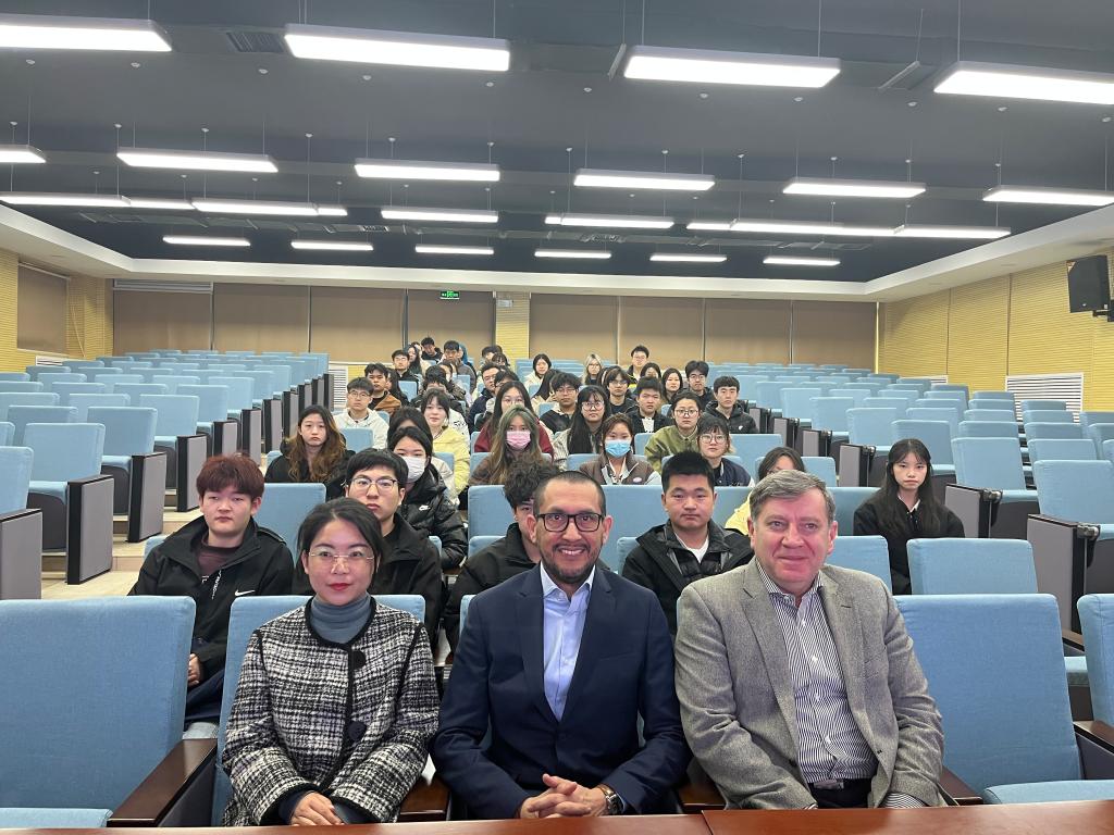 双方会见前,拉蒙尤以大学副校长Neamtu Laurentiu和该校项目管理系主任Castro gernandez Juan antonio在建德楼202报告厅为beat365师生做了《西班牙高等教育与文化》专题讲座,现场学生认真聆听。