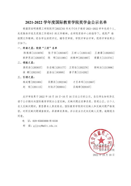 此评审结果于2022年10月10日-10月16日在公示栏公示,各位师生如有异议请于公示期内向国际教育学院办公室反映,反映问题应实事求是、客观公正。以个人名义反映问题时,要签署本人真实姓名。国际教育学院将对反映人和反映问题严格保密,对所反映问题调查核实,弄清事实真相,并以适当方式向反映人反馈,逾期视为同意。