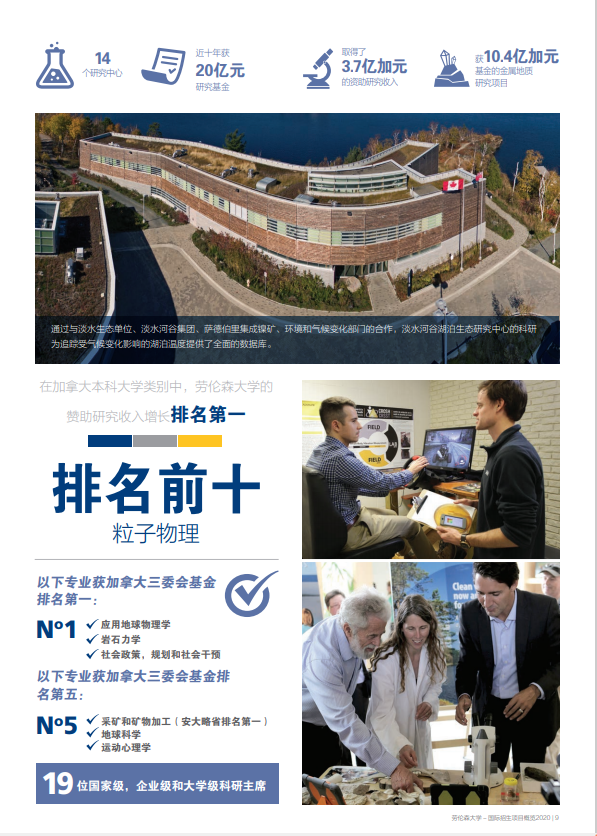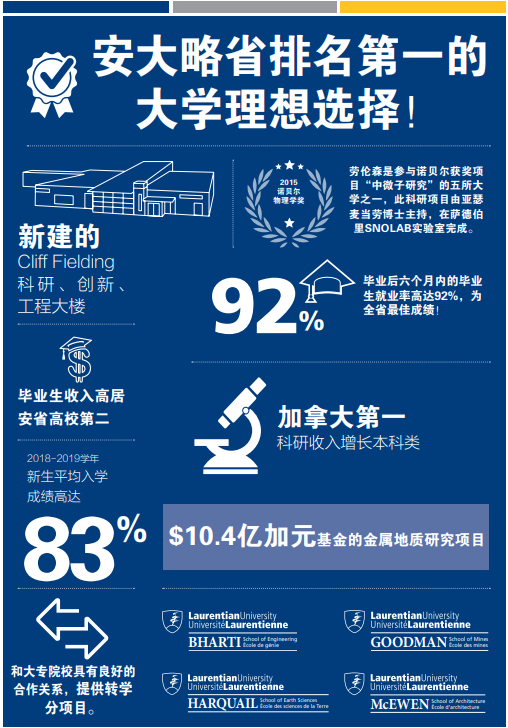 劳伦森大学创办于1960年,位于安大略省中心的萨德伯里市。大学开设了超过175个专业课程,涵盖了本科、硕士和博士三个教育层次。劳伦森大学是加拿大国家精神的缩影:开放、热情、英法双语、多元文化、强大、北方和自豪。工商管理、科学、工程、健康管理、人文学等是劳伦森大学的优势专业,多数专业提供英、法双语教学。小班教学是劳伦森大学的特色,1:18的师生比例为学生提供了卓越的学习环境,促进了学生与教授及院系的沟通,有利于学生在科研和学术方面取得更好的成绩。劳伦森大学占地750英亩,风景如画的校园与自然环境融为一体,热情地欢迎着9000多名学生在校学习。