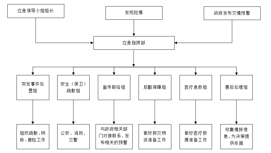 成立自然灾害应急指挥部、自然灾害应急处置工作组、抢险救护组、疏散处置组、宣传报道组。