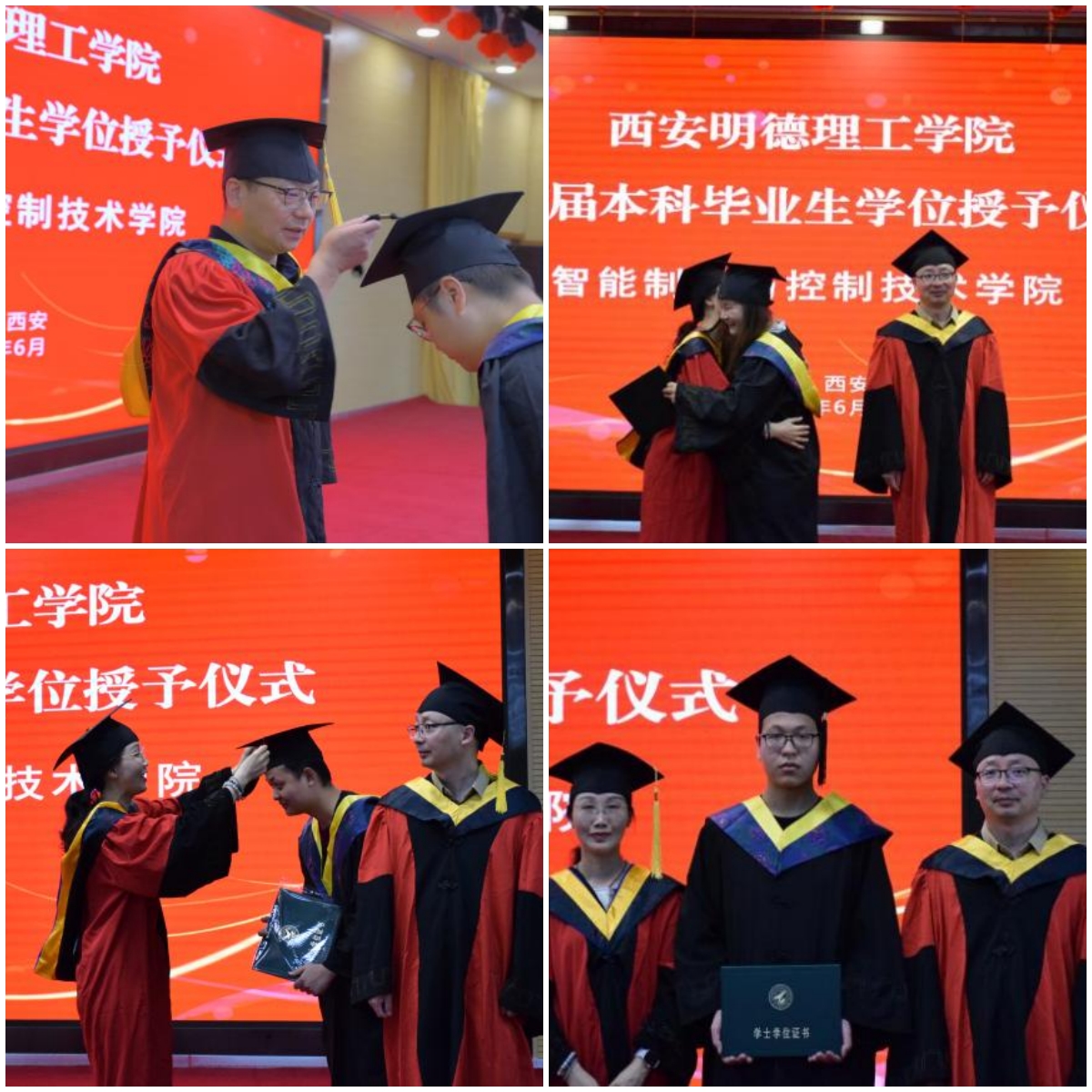 学位授予仪式上,毕业生分别上台鞠躬谢恩,朱延波副校长、殷锐院长、李建勇副院长与学子握手祝贺,并为毕业生拨穗正冠并授予学位证书。