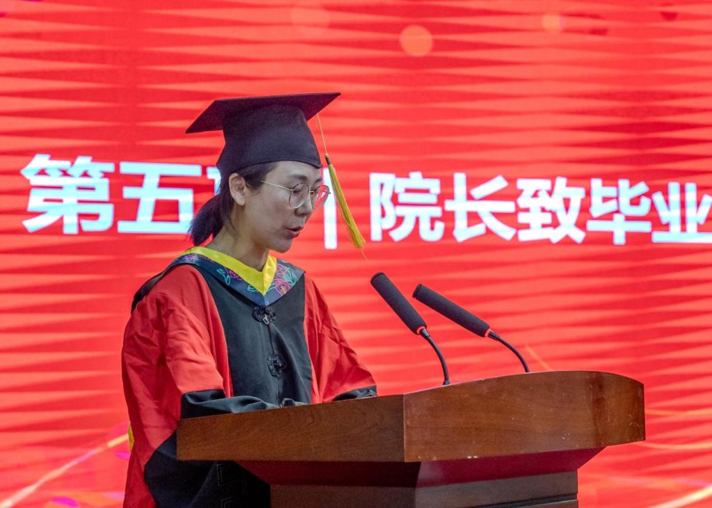 学院执行院长翟书颖教授致毕业寄语。她代表学院向圆满完成学业的同学们致以热烈的祝贺。肯定了毕业生在过去几年取得的突出成就、做出的积极贡献。并为毕业生们送上寄语:一是要不负时代、追逐理想。希望同学们带着学院的烙印,把个人的发展融入中华民族伟大复兴新征程,在学思践悟中坚定信念,在服务人民中彰显价值,在至诚报国中建功立业。二是要不懈学习、提升自我。希望同学们在社会的大课堂中积极适应需求、积极投身实践,在不断探索中增加才干、提升本领。三是要秉持初心。希望同学们遵循内心的想法,保持纯真的本心,持续地去行动、去坚持,坦然面对成长的阵痛,淡然看待人生的得失。