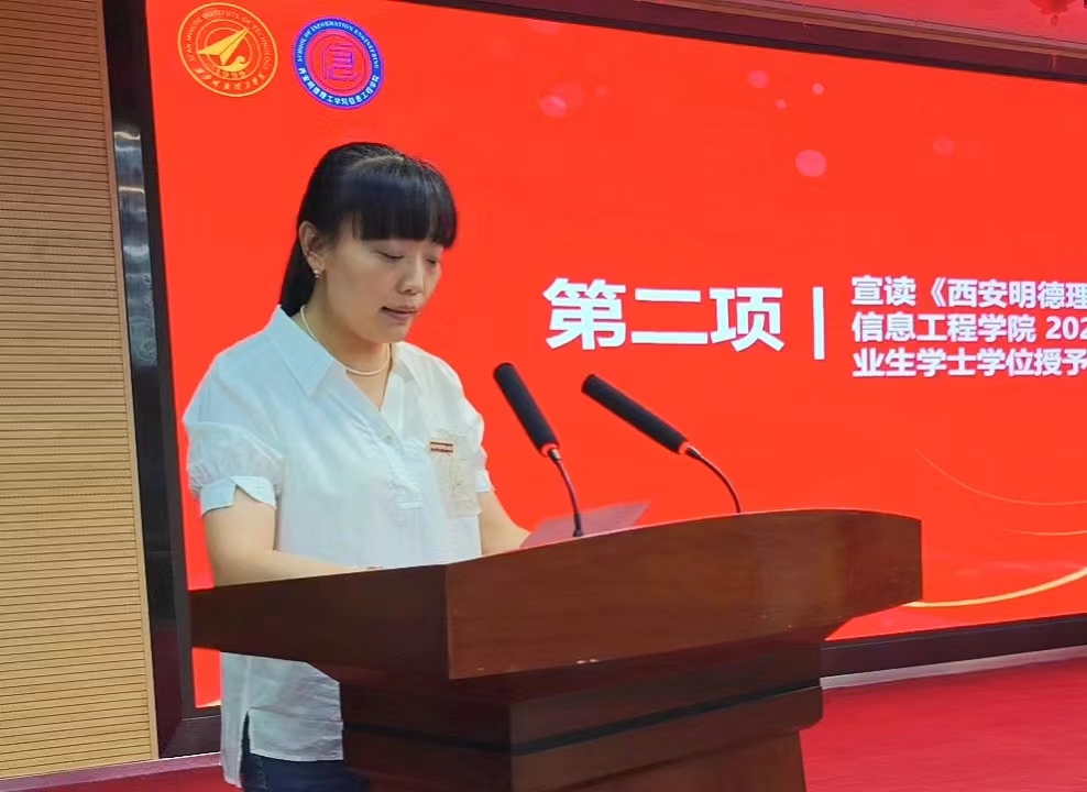 学院办公室主任尹莹宣读《beat365vip官网登录入口关于信息工程学院2024届本科毕业生学士学位授予的决议》。