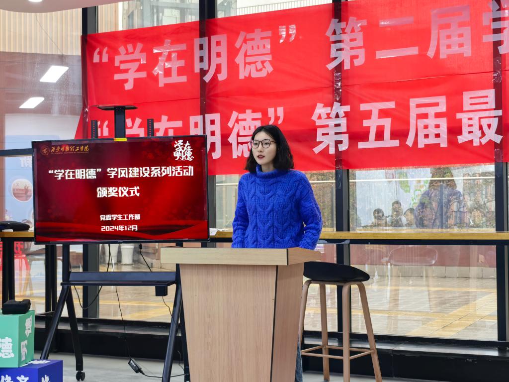 为加强学校优良学风建设,进一步打造“学在明德”学风建设品牌,营造积极浓厚的校园学习氛围,12月12日,党委学生工作部在百合楼“一站式”学生社区成功举办“学在明德”学风建设系列活动颁奖仪式。党委学生工作部副部长童杨梓,智能制造与控制技术学院党委副书记曾凯、语言文化传播学院党委副书记杨峰、经济与管理学院党委副书记冯纪潮、艺术与设计学院党委副书记乔建、高等职业技术学院党总支副书记王飞,党委学生工作部相关人员以及获奖师生参加了颁奖仪式。