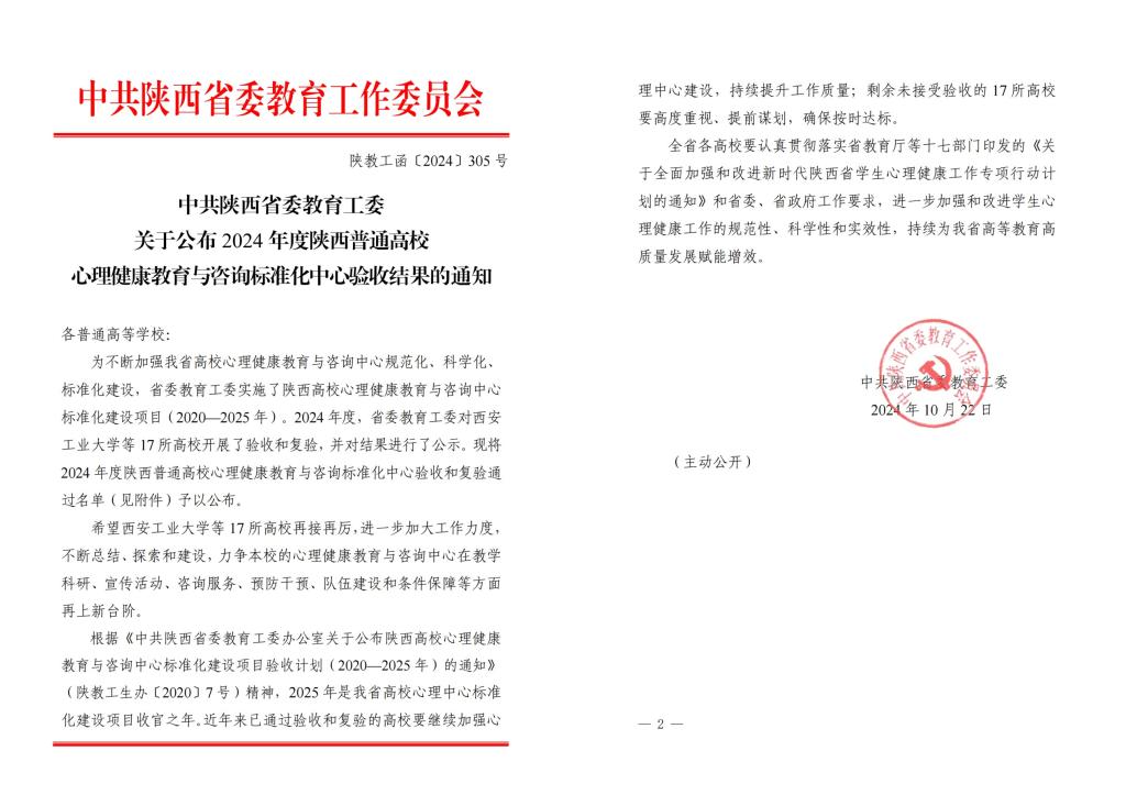 近日,中共陕西省委教育工委公布了《中共陕西省委教育工委关于公布2024年度陕西普通高校心理健康教育与咨询标准化中心验收结果的通知》,学校顺利通过此次验收,大学生心理健康教育中心获评“陕西普通高校心理健康教育与咨询A类标准化中心(原陕西普通高校心理健康教育与咨询示范中心)”。这是学校心理育人工作继2023年顺利通过陕西高校心理健康教育与咨询标准化中心建设验收后,又一次取得的标志性成果。