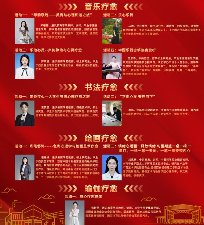 为认真贯彻落实教育部等十七部门《全面加强和改进新时代学生心理健康工作专项行动计划(2023—2025年)》《教育部办公厅关于开展首个全国学生心理健康宣传教育月活动的通知》以及陕西省教育厅等十七部门《全面加强和改进新时代陕西省学生心理健康工作专项行动计划》精神,扎实推进学校心理健康教育提升行动,引导学生有效运用不同听觉、视觉艺术材料和媒介方式,进行自我创作、自我探索和自我对话,缓解内心冲突,改进行为管理,释放心理压力,纾解不良情绪,增强自信心,进而达到改善和提升自身的生理、心理和情绪健康,塑造自尊自爱、理性平和、积极阳光的心态,学校于5月27日-31日举办了首届艺术疗愈文化节活动,并于6月17日-21日在明志楼大厅举办了首届艺术疗愈文化节系列活动成果展。本次活动由马克思主义学院、党委学生工作部、通识教育学院共同举办。