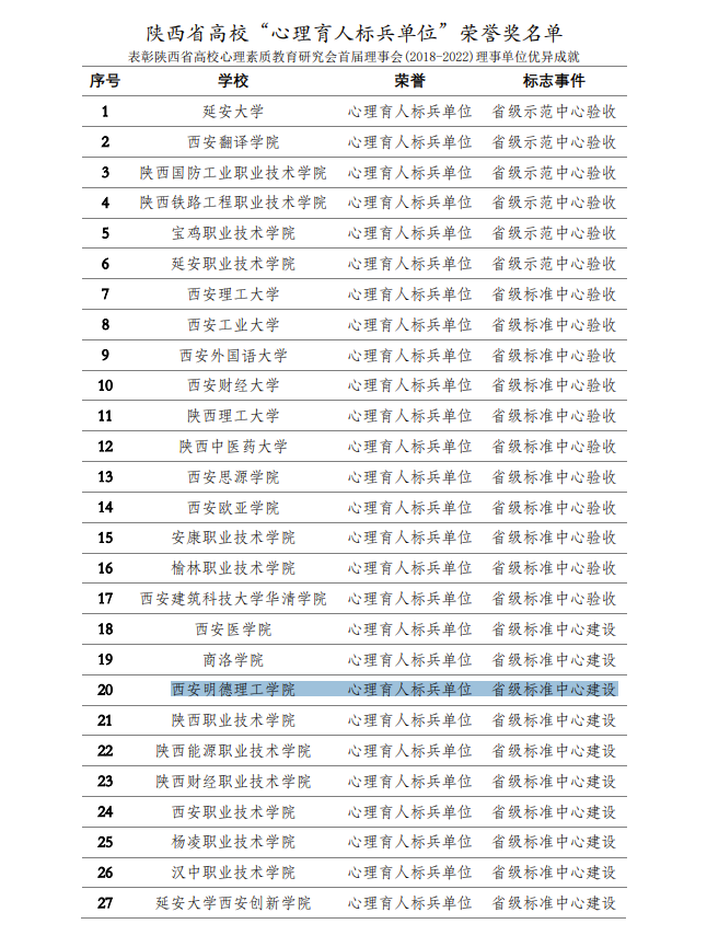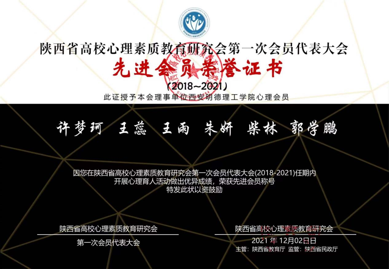 2018年,学校顺利入选陕西省高校心理素质教育研究会首届理事会单位。五年以来,在陕西省高校心理素质教育研究会首届理事会的带领下,学校高度重视心理育人工作,心理健康教育专兼职教师同心同德、同心同向,聚焦心理育人工作努力拼搏,受到了陕西省高校心理素质教育研究会的充分肯定,获得了陕西高校“先进会员”单位、陕西高校“心理育人标兵单位”等荣誉称号。
