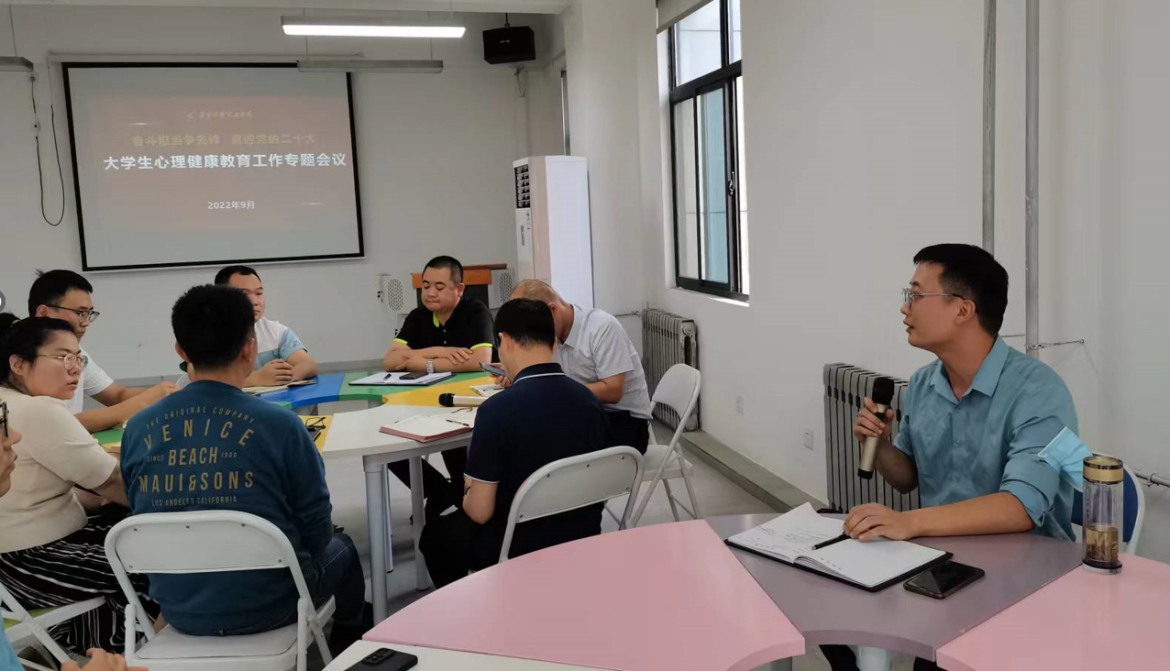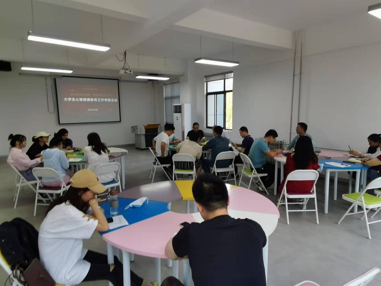 9月1日,大学生心理健康教育与咨询中心在团体辅导室开展了2022年秋季学期大学生心理健康教育工作专题会议,党委学生工作部副部长童杨梓,各学院相关负责人、心理辅导员以及心理中心专、兼职教师参加了本次会议,会议由薛飘主持。
