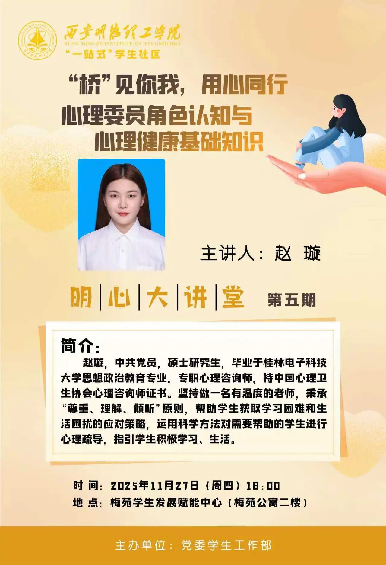 一、培训时间2025年11月27日 18:00二、培训地点beat365vip官网登录入口长安校区梅苑学生发展赋能中心(梅苑公寓二楼)三、报告会专家党委学生工作部 赵璇四、培训对象 智能制造与控制技术学院、国际教育学院班级与宿舍心理委员明天我们不见不散~