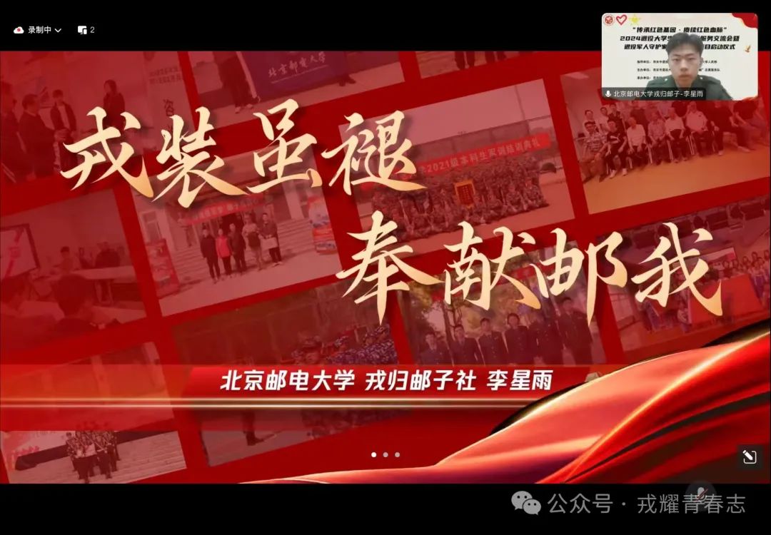 优秀项目展示环节,全国 6 支退役大学生士兵志愿服务组织纷纷登台分享。北京邮电大学戎归邮子社分享了退伍大学生在国防教育宣讲等方面的突出表现;