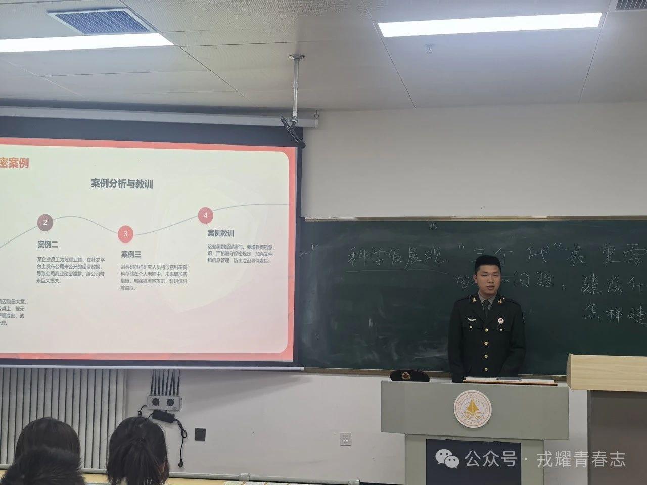 活动开始,退伍大学生借助精心制作的PPT,为同学们详细讲解国家安全教育日的来历与重要意义,阐述国家安全是国家生存发展的基石。从宏观层面看,保密工作在国家政治、经济、军事领域发挥着不可替代的作用。军事保密一旦出现漏洞,战略部署可能被敌方洞悉,军事行动面临受阻风险,进而威胁国家主权与领土完整;在经济领域,商业机密与关键技术信息的泄露会损害国家经济竞争力。