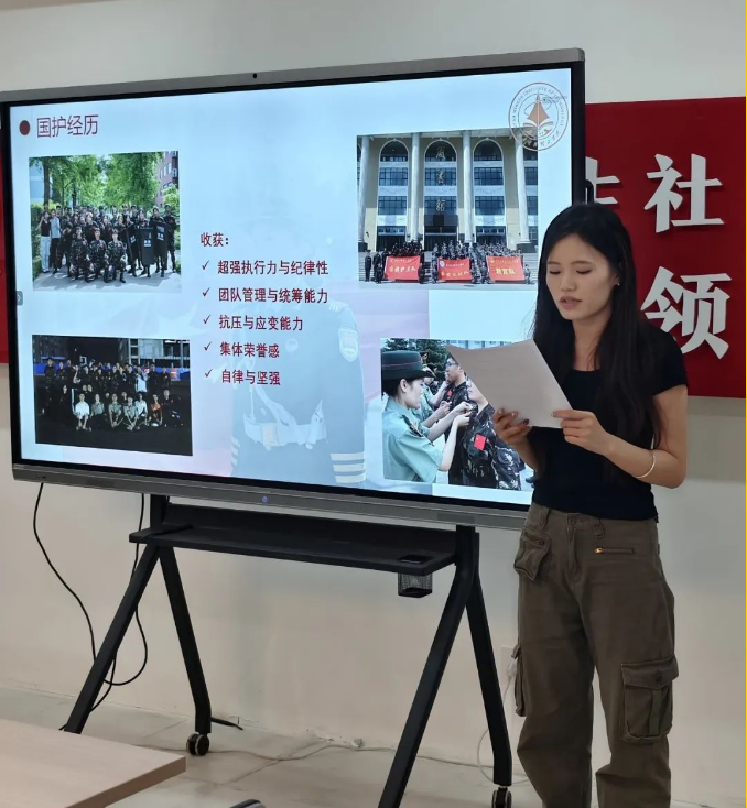 杨楠同学作为国旗护卫队原队长,从国护经历、学习经历以及给同学们的建议,讲述了自己在社团的收获与成长,希望国旗护卫队的队员们像旗杆一样,向下扎根汲取力量,向上成为激励他人的光。她号召队员们也能在各自的专业领域里发光发热,照亮前进的道路。